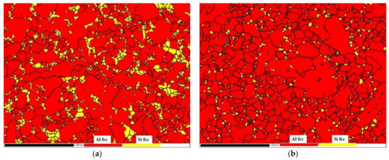 The EBSD phase distribution maps of the non-heat-treated, die-cast samples before and after heat treatment are shown in Figure 4. Both Al and Si in the die-cast sample had a face-centered cubic structures. The Si grain boundary particles were found to be a solid solution that had decomposed after heat treatment by comparing the EBSD phase distribution maps of the samples before and after heat treatment. The particles became smaller and the distribution was more uniform, which was consistent with the results obtained from the metallographic structure picture.