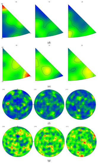 EBSD maps of non-heat-treated, die-cast samples before heat treatment: (a) X0 direction, (b) Y0 direction, (c) Z0 direction, (d) Al pole figures, (e) Si pole figures, (f) Al reverse pole figures, (g) Si reverse pole figures.