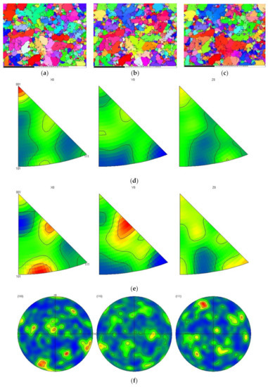 EBSD maps of non-heat-treated, die-cast samples after heat treatment: (a) X0 direction, (b) Y0 direction, (c) Z0 direction, (d) Al pole figures, (e) Si pole figures, (f) Al reverse pole figures, (g) Si reverse pole figures.