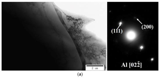 To gain a deeper understanding of the crystal structure of the non-heat-treated, die-cast samples, Figure 7 and Figure 8 show TEM images of the samples. The crystal structures of the sample before and after heat treatment presented a massive grain structure when observed on a high magnification transmission electron microscope (TEM). The electron diffraction pattern analysis results of the selected study area showed that the matrix was Al phase, which was consistent with the XRD results. However, a large number of dispersed second phases with small sizes, down to the nanoscale, appeared in the Al matrix after heat treatment, as seen by comparing Figure 7a,b. This was the main reason for the increased tensile strength. TEM images at different positions of the sample before heat treatment are shown in Figure 8. Figure 8a shows that the micron-sized, large particle reinforcement phase, which was determined to be Si by EDS, was distributed on the grain boundary of Al. The results were consistent with the EBSD phase distribution diagram. The existence of Al-Mn and Al-Cu phases was found in Figure 8b,c. The existence of dispersed nano-Cu phases was detected by a high-resolution lattice diagram, as shown in Figure 8d.