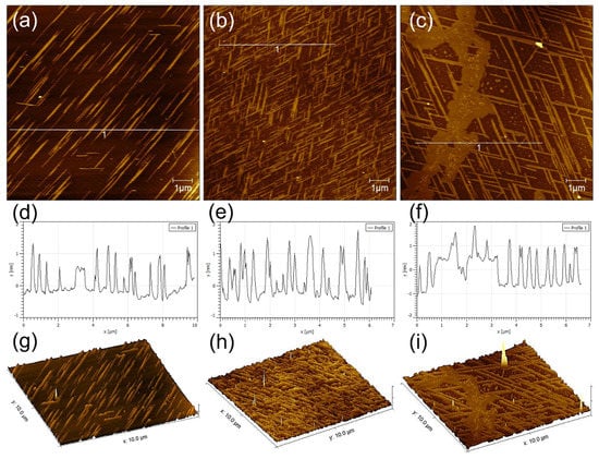 GNNQQNY peptides self-assemble on the mica surface to form nanofibers and nanoribbons with the height of 0.6–1.5 nm and nanoribbons with the height of 1.5–2.2 nm. In addition, the peptides also form some thin films on the mica surface. As shown in Figure 1a–c, the formed nanostructures show highly regular directionality among each other, and several distribution patterns often appear mainly including single directional nanoribbons, bi-directional nanoribbons with an intersection angle of 60°, and tri-directional nanoribbons with an intersection angle of 60°. Among them, bi-directional nanoribbons with an intersection angle of 60° are the most common, and unidirectional and tri-directional nanoribbons are not easily formed. As shown in Figure 1d–f, the section analysis corresponding to the AFM height images of Figure 1a–c indicates that these nanoribbons/nanofibers are highly uniformly distributed. Figure 1g–i shows a 3D morphological analysis that corresponds to the AFM images in Figure 1a–c, which clearly proves the formation of directional structure of GNNQQNY peptides on mica.