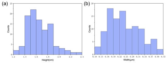 To investigate the dimensions of the nanoribbons that were formed by the self-assembly of GNNQQNY on the mica surface, we performed the statistical analysis of the heights and width of peptide nanoribbons that are shown in Figure 1b, and the histogram distributions are shown in Figure 2. It can be found that the height of peptide nanoribbons is mainly concentrated in the interval of 1.4–1.9 nm, with the average height at 1.65 nm (Figure 2a). In addition, the width of peptide nanoribbons is mainly concentrated in the interval of 160–340 nm, with the average width at 240 nm (Figure 2b). It should be noted that the height of the self-assembled peptide nanoribbons is uniform in all the obtained AFM images, while the width of nanoribbons varies with the change of experimental conditions.