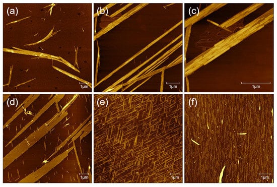 The solution concentration is decisive for the incubation of peptides on the surface of mica to form directional nanoribbons and nanofibers. Figure 4 shows AFM images of different concentrations of peptides that incubated on mica for surface-guided molecular self-assembly. When the peptide concentration was of 0.1, 0.2, 0.3, 0.4, and 0.5 mg/mL, the fiber clusters were observed on mica, and no directional filament or nanoribbon structure was observed. At the concentration of 0.25 mg/mL, it can be observed that not only curved long fibers, but also directional nanofiber and nanoribbon structures were formed on the surface of mica. According to previous report [], the peptide GNNQQNY in aqueous solution will self-assemble to form fibers immediately. We believe the peptide concentration of 0.25 mg/mL is optimal for inducing the self-assembly and formation of directional nanofibers and nanoribbons on mica surface.