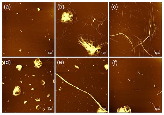 Self-assembled peptide nanostructures on mica by adjusting the peptide concentration with (a) 0.1, (b) 0.2, (c) 0.25, (d) 0.3, (e) 0.4, and (f) 0.5 mg/mL.