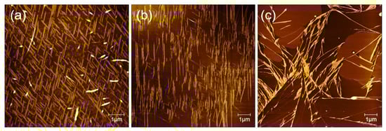 Figure 5 presents typical AFM height images of peptide nanostructures that formed under different pH conditions on mica surface. In the context of pH = 2, peptides form a dense nanoribbon “cross-network” structure on the surface of mica. The reason for the formation of this dense and uniform “cross-network” nanobelt cluster is that the decrease in the pH of the solution regulates the adsorption of peptide molecules to mica and its incubation rate []. It is clear that the formed nanoribbons exhibit uniform orientations with a connection angle of about 60 degrees between the two directions (Figure 5a). We suggest that the GNNQQNY peptide has a whole isoelectric point of 5.52, which reveals positive charge in the acidic environment at pH = 2 []. Therefore, the electrostatic interactions between positively charged peptides and negatively charged mica surface mediated the surface structure-guided self-assembly of peptide molecules. When the solution pH is below 2, the number of peptide nanostructures becomes smaller and smaller, and when pH is below 1.6, there is virtually no orderly peptide nanoribbons on the surface of mica. An over-acid environment is not conducive to the incubation of peptide molecules on the surface of mica, which can lead to inactivation of peptide molecules.