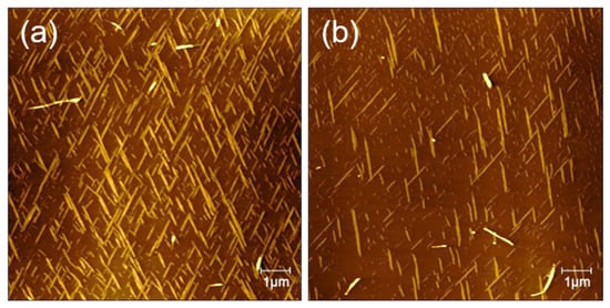 As shown in Figure 3a, in pure water solvents, the AFM image indicates that GNNQQNY peptides form mainly irregular nanofibers or nanoribbons, which is consistent with previous reports on the formation of GNNQQNY nanostructures in pure water []. In the TFE solution, it is found that straight peptide nanoribbon structure is arranged in a single direction, and at the edge of the nanoribbons some small nanofiber structures are created. It is interesting that the formed nanofibers are parallel in the other direction, indicating that the self-assembly of peptide molecules on the surface of mica forms a single direction nanoribbon structure at first and then begins to form directional nanostructure with an angle of 60 degrees (Figure 3b).