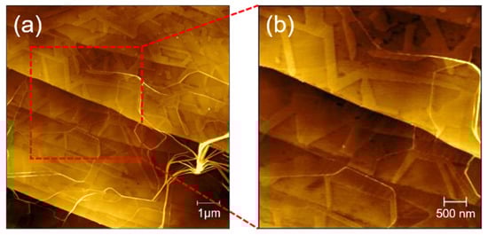 In order to study the influence of different material interfaces on peptide self-assembly, we further examined the formation of peptide nanostructures on HOPG. Figure 7 shows the AFM image of a peptide solution of TFA (0.1%) and TFE mixture (v/v, 1:1) incubated on the surface of HOPG. As shown in Figure 7a,b, the surface of HOPG has a clear nanoribbon structure. The nanoribbons are arranged in two or even three directions (with an angle of 60 degrees). The height of the nanoribbons is about 1 nm, and the width is generally more than 200 nm. In the image, there are not only oriented nanoribbons, but also a certain number of curved nanofibers quickly assembled in the solution. Their height is higher than the self-assembled fibers on the surface, but they have no directionality. Compared with the incubation of peptides on the surface of mica under the same conditions, self-assembly on HOPG will obviously generate nanoribbons with a larger width and that are flatter. The distribution is not so dense, but it is easy to form nanoribbons in three directions. The differentiation of the self-assembly of GNNQQNY on the surface of mica and HOPG is due to the hydrophilic and hydrophobic properties of mica and HOPG and the difference in surface crystal structure.