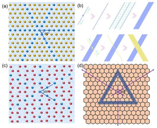 Self-assembly mechanisms of peptide on mica and HOPG: (a) hexagonal atomic arrangement of mica surface (the yellow balls represent the oxygen atoms on the mica, and the blue balls represent the oxygen atoms under the orderly coverage of the peptide.), (b) schematic self-assembly of peptide on mica surface, (c) hexagonal atomic arrangement of HOPG surface (the red balls represent the carbon atoms on the mica, and the blue balls represent the carbon atoms under the orderly coverage of the peptide.), and (d) schematic self-assembly of peptide on HOPG surface.