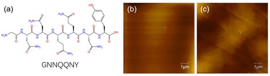 (a) Molecular structure of GNNQQNY peptide; (b) AFM image of freshly uncovered mica; (c) AFM image of freshly uncovered HOPG.3.1. Self-assembly of GNNQQNY on mica surface.