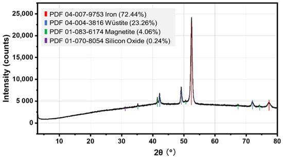 A neat base asphalt binder with a penetration of 82 dmm, a softening point of 46.3 °C, dynamic viscosity of 188 Pa·s at 60 °C, and a density of 1.01 g/cm3 at 25 °C is used in this study. The aggregates include crushed rocks and steel slag, and are provided by Franzefoss Pukkverk (Heimdal, Norway) and Skanska Stålfabrikk (Melhus, Norway), respectively. The rock aggregates are mainly composed of fine-grained gabbro/metagabbro and are widely used for road construction in the central part of Norway [45,46]. As a typical magnetic material, steel slag is adopted as a microwave absorber in the asphalt mixtures to generate heat. According to the X-ray diffraction pattern of the steel slag illustrated in Figure 2, the existence of metallic composites proves that the material can help to increase the microwave heating capacity of the mixtures.