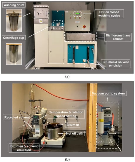 The aged asphalt binder is extracted from the mixtures through an extraction machine (Asphalt Analyzer YOU, InfraTest, Brackenheim, Germany), together with dichloromethane solvent. The crumbled asphalt samples are placed into a washing drum and undergo a series of eight washing cycles, an amount selected to make sure that the asphalt binder can be totally extracted from the mixtures (Figure 3a). Subsequently, the acquired bitumen and dichloromethane mixtures are separated by employing a rotary evaporator (Buchi, Flawil, Switzerland), thanks to their different evaporation temperatures (Figure 3b). Finally, the pure aged asphalt binder can be collected and further analyzed.