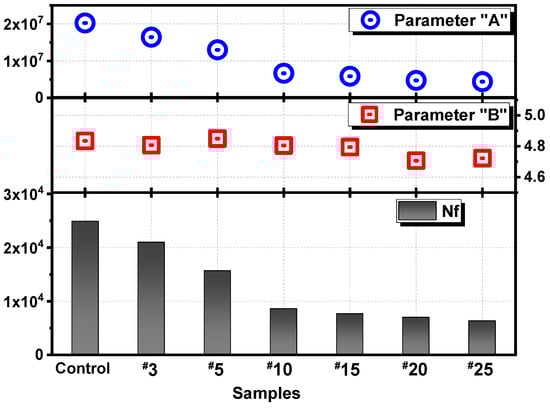 The parameters A and B can be obtained from the accelerated LAS test to evaluate the fatigue resistance. The value of the storage modulus is reduced during the process of the amplitude sweep, indicating the decreasing ability of the asphalt binder to maintain its integrity during loading cycles and the accumulated damage process, and this trend can be represented by parameter A [50]. Meanwhile, parameter B is related to the sensitivity of the asphalt binder to strain level change, and a higher value of this parameter indicates that the fatigue life decreases at a greater rate when strain level amplitude is augmented. In summary, a better fatigue resistance ability of asphalt binder is associated with a higher A value and lower B value [51]. As Figure 4 shows, parameter A clearly decreases with the increase in MH cycles. Nf follows a similar trend, which demonstrates that the fatigue parameter A plays a primary role in determining the fatigue life of asphalt binder.