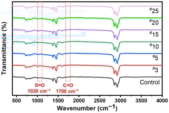 Figure 5 shows the FTIR spectra of microwave-treated asphalt samples; overall, the spectra curves are similar. The main oxygen-containing functional groups, namely sulfoxide (S=O) and carbonyl (C=O), appearing at 1700 cm−1 and 1030 cm−1, respectively, are adopted as the main indicators of asphalt aging. The aging indexes IC=O and IS=O have a similar changing trend as presented in Table 1: the aging index of the sample treated with 10 microwave cycles (#10) is approximately 1.2 times higher than the index of the control specimen. The increase in IS=O index does not follow a precise trend, while the IC=O of #15, #20, and #25 is about 1.29, 1.40, and 1.50 times larger than the control sample. This minor difference between the above two aging indexes after 10 MH cycles may be attributed to the fact that the microwave energy causes chemical changes in asphalt at the molecular level [22], which would cause a deviation in the determination of oxidative aging parameters. In summary, the FTIR results are consistent with the characteristics of MH on the asphalt aging observed from the LAS tests.