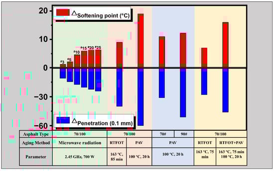 In Section 4.1 and Section 4.2, laboratory study is conducted to estimate the microwave aging effect on asphalt binders by characterizing the changes in the rheological properties and molecular structures. Considering the fatigue lives derived from the LAS tests, the microwave radiation does cause aging on asphalt binders, especially during the initial applied MH cycles. Under the conditions of this study, an obvious deterioration of fatigue lives can be observed within 10 MH cycles, while minor changes can be detected during further MH cycles, and the aging indexes acquired from FTIR agree well with this trend. To intuitively analyze the extent of the aging degree caused by microwave radiation, Figure 6 compares the penetration and softening point parameters obtained in this study with other findings reported in the literature testing similar asphalt type with different aging methods according to NS-EN 1426 and NS-EN 1427 [53,54]. Considering the results attained in this study after cyclic MH treatment, the values follow the similar changing trend as Nf indicated in LAS tests. The changes in physical properties are relatively apparent during the first few cycles and then level off after 10 cycles. When comparing these outcomes with the laboratory aging data collected from other tests [55,56,57], the deterioration reported by MH technology is not considerably significant. Therefore, bearing in mind the various benefits of MH technology (rapidity of execution, uniform and non-polluting treatment, deep penetration), the aging impact on asphalt binders is within an acceptable range. Furthermore, other interventions, such as adding encapsulated rejuvenators, adjusting microwave heating parameters, and selecting the proper microwave maintenance frequency, could hinder aging, to some extent.