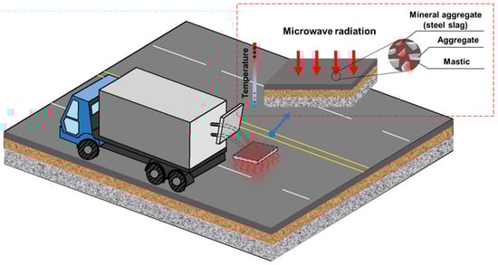Compared with other heating methods (i.e., hot air, flame, infrared, electric coils, and hydronics), the microwave heating (MH) technique is considered as an innovative maintenance solution due to its rapid, uniform, non-polluting, and deep penetrating heating characteristics [3,4,5]. Microwaves are a form of electromagnetic waves in the frequency range of 300 MHz to 300 GHz [6], which generate a volumetric heating phenomenon [7]. When it comes to their field application, the high-frequency, reciprocating motion of internal dipole molecules promotes the generation of internal friction heat under the microwave radiation [8,9]; meanwhile, the flow and diffusion of asphalt binder contributes to crack repair at high temperatures. However, the microwave-absorbing ability of conventional asphalt concrete is quite limited due to its low susceptibility; thus, microwave absorbers (i.e., steel slag [10], metallic fibers [11], and carbon nanomaterials [12]) can be added into mixtures to enhance the conversion efficiency of electromagnetic energy into thermal energy. The microwave absorber considered in this study is steel slag. Its use in road pavement infrastructures can not only improve the road performance [13,14], but also represents an environmentally friendly practice as it prevents or reduces the consumption of natural resources [15]. In order to satisfy the volume stability of steel slag, some pretreatment methods, such as cooking and autoclave [16], should be adopted to reduce the content of free CaO to less than 3% [17]. Previous research has indicated the physical properties of steel slag can fulfil the road performance requirements [18,19], while more technical and environmental studies need to be carried out before employing steel slag in actual asphalt pavements. Furthermore, the MH technique can also be successfully applied, considering recycling reclaimed materials, pothole patching, and deicing [20,21,22].