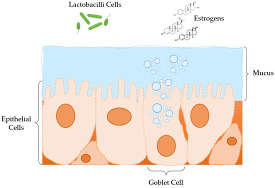 The vaginal epithelium is coated in a mucous layer, which consists of water, a matrix of mucins (glycoproteins with high MW), enzymes, plasma proteins, amino acids, lipids, cholesterol, and a number of inorganic ions [20,21,22]. Mucous secretions (composition, quantity, and physical characteristics) depend on the menstrual cycle, as oestrogens affect their production. They are produced from goblet cells in the epithelium of the endocervix and Bartholin glands. However, the squamous epithelium of the vagina and ectocervix are not involved in the production of mucus. Furthermore, this mucus layer is structurally analogous to a complex net of tangled microfibers with multiple coarsened folds, which enhance the absorption surface. Specifically, during ovulation, the amount of mucus secretion is augmented, creating larger, thicker, and more viscous pores, leading to an increase in the total volume of vaginal fluid, a higher pH, and mucin content. Hence, mechanical, and structural features of vaginal mucus have a significant impact on drug targeting and release rate, affecting the pharmacodynamics of certain drugs [10].