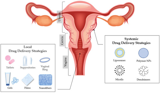 A proper pharmaceutical formulation has to be described by quality characteristics, such as safety, efficacy, stability, and acceptability. However, many considerations have to be taken into account when developing a drug product for vaginal administration [8]. The choice of the dosage form depends on the physical and chemical characteristics of the drug, its mechanism of action, the target of the formulation and last but not least patient comfort [8,31]. Many pharmaceutical formulations have been used for drug delivery to the vagina. Despite the fact that traditional formulations, such as vaginal creams [32,33], gels [34,35,36], tablets/capsules [37,38] and suppositories [39] have a prevalence, there are other more novel dosage forms such as films [40] intravaginal rings [41,42,43] and nanomedicines [14] (Figure 2).
