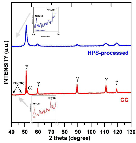 X-ray diffractograms obtained for coarse-grained and HPS-processed S304H steel.
