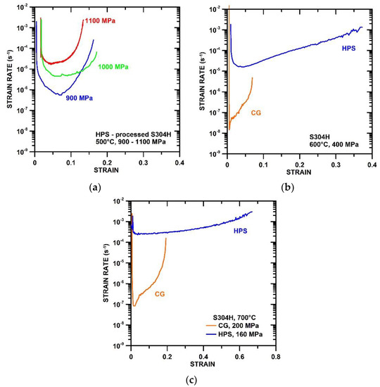 Figure 4a–c shows the dependences of the strain rate against strain. The creep results show that strain to fracture is significantly higher in the HPS-processed state in comparison with the CG state. It is seen that strain to fracture decreases significantly with decreasing testing temperature when the creep tests with similar minimum creep rates () are compared. The creep results also demonstrate that the length of the primary stage in the HPS-processed state is relatively long in the specimen tested at 500 °C. However, the length of the primary stage decreases with increasing testing temperature.