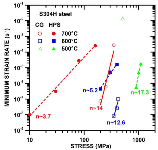 The creep tests performed at 500 °C showed that the creep behavior of the HPS and CG states is too different that it was not possible to perform the creep tests at the same stress interval. The creep results measured at 500 °C demonstrate that the minimum creep rates of the HPS-processed state determined at stresses between 900–1100 MPa were significantly slower than the minimum creep rate for CG state measured at 510 MPa. This is the opposite result to that found at 600 °C and 700 °C. The results for the HPS-processed state measured at 500 °C also demonstrate that the decrease in testing temperature led to a significant increase in stress exponent n to the value about 17.