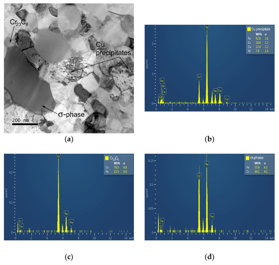 TEM micrographs for HPS-processed steel tested at (a) 600 °C and 400 MPa, (b) chemical composition of Cu precipitate, (c) chemical composition of Cr23C6 carbide and (d) chemical composition of σ-phase.