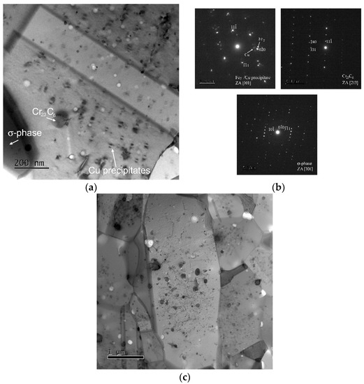 TEM micrographs for HPS-processed steel tested at (a) 700 °C and 30 MPa, ε = 0.1, creep time ~ 65 h; (b) diffraction patterns of Cu precipitate, Cr23C6 carbide and σ-phase, (c) 700 °C and 30 MPa, ε = 0.4, creep time ~ 235 h.