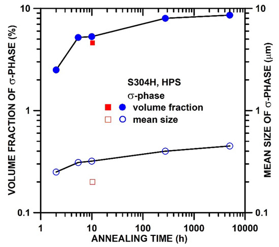 Mean size and amount of σ-phase in HPS-processed microstructure after static annealing at 700 °C and 600 °C. Blue symbols are for 700 °C and red symbols for 600 °C.