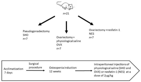 The animals were randomly divided into three experimental groups. The first control (SHO, n = 7) included rats in which pseudogonadectomy surgery was performed. Fourteen rats underwent bilateral removal of the ovaries. The procedures were performed under general anesthesia. In this case, intramuscular injections were used applying ketamine (Biowet Puławy, Puławy, Poland) in the dose of 3 mg/kg BW, xylazine (Biowet Puławy, Poland) in the dose of 10 mg, and atropinum sulphuricum (Polfa-Warszawa S.A., Warsaw, Poland) in the dose of 0.05 mg/kg BW. During the ovariectomy, after preparation of the operating field, a 7–8 cm incision of the abdominal wall was performed in the midline. The left and right ovaries were isolated from the uterine horns and then ligated and removed. Then, the operating wound was sutured. During the pseudogonadectomy, after incision of the abdominal wall, the viscera was manually repositioned, and then the operating wound was sutured. After surgery, the animals were kept under standard zoohygienic vivarium conditions for 12 weeks to induce osteopenia in the ovariectomized animals. After this period, the ovariectomized rats were randomized into two groups of 7 animals each. The OVX group received physiological saline by intraperitoneal injection. Rats in the NES group were administered nesfatin-1 at a dose of 2 µg/kg body weight (Phoenix Pharmaceuticals, Inc., Burlingame, CA, USA). The injections were made once daily for 8 weeks. Nesfatin was dissolved in saline before use. The rats in the SHO and OVX groups were administered saline in an amount corresponding to the nesfatin solution in the NES group. After 8 weeks, the animals were sacrificed by CO2 overdose preceded by 12 h night fasting (with water access). The scheme of the experimental setup is presented in Figure 1. After euthanasia, the isolated right and left humerus were subjected to densitometric measurements. Subsequently, the bones were secured at −20 °C for further mechanical analyses.
