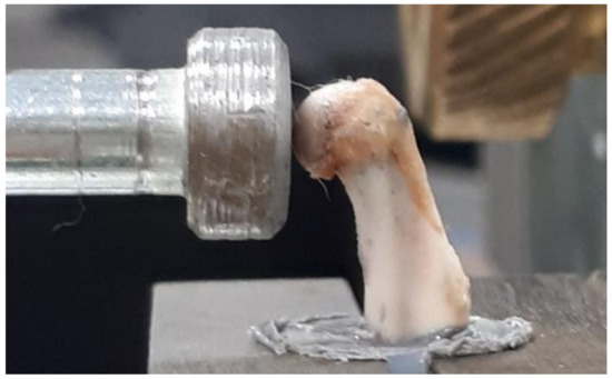 The device for the impact study was composed of a base with two columns as load-bearing elements and three horizontal links. A pendulum with a rigid 924 mm long arm was mounted on the upper link. The arm was fitted with the measurement head equipped with a piezoelectric force sensor (2311-100 model, Endevco Corporation, Irvine, CA, USA) of 2.25 mV·N−1 sensitivity and a measurement range of ±220 N. The measuring head can be displaced in the vertical and horizontal plane, and its position was set by adjusting screws. The pendulum was connected with the angular displacement sensor RON 275 (Heidenhain, Traunreut, Germany) with the accuracy of 0.005°. The sensor recording inclination angle change was connected to the measuring card (SBC-68, National Instruments, Warsaw, Poland), transmitting signals to the application working in the LabView environment [9,10,11,30]. The right humerus was fixed with quick-drying epoxy glue in a PVC tube with an internal diameter of 15 mm and a 20 mm height. The bone was fixed vertically so that a deltoid tuberosity was above the glue surface. The sample was left in the air for 20 min to set the adhesive. After this time, the bone was placed in a specially designed holder. The humerus head was impacted at a velocity of 0.5m·s−1, which corresponded to the pendulum deflection by an angle of 9.15°. The position of the bone and the hammer during the impact test is presented in Figure 2.