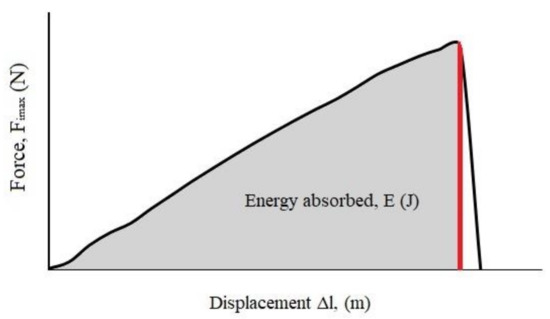 The obtained force–displacement curves were analyzed to determine the maximum force (fracture load) and energy absorbed during the impact (E). The energy was found from the area under the loading curve (Figure 3) by integrating to the maximum force (Graph, free software, version 4.4.2). It could also be determined from Equation (1), assuming that the kinetic energy of the hammer is many times larger at the time of impact compared to the energy required for the sample fracture [9]: