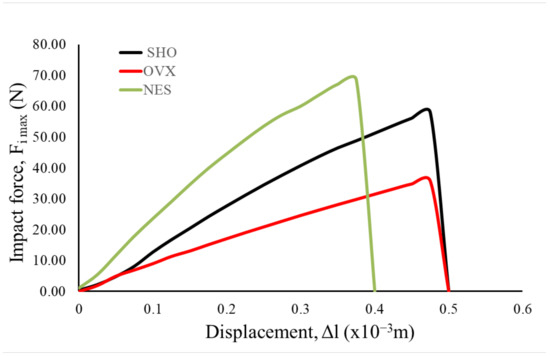 The mechanical analysis results under the impact loading conditions confirm the results of the three-point bending test carried out under the quasi-static conditions. It was proved that ovariectomy leads to maximum force (Fi max) decrease, registered in the impact test. The average value of Fi max was 36.23 N (Table 3). For this group, the lowest slope of the force–displacement curves was also observed (Figure 4).