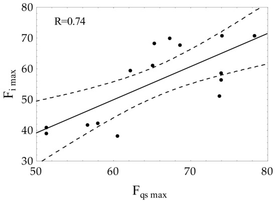The correlation analysis (Figure 5) showed a positive Pearson’s correlation coefficient (R = 0.74) between the maximum forces measured in the impact test (Fi max) and under the quasi-static condition (Fqs max). The above indicates that values of Fi max can be used for the evaluation of bone toughness together with other mechanical parameters.