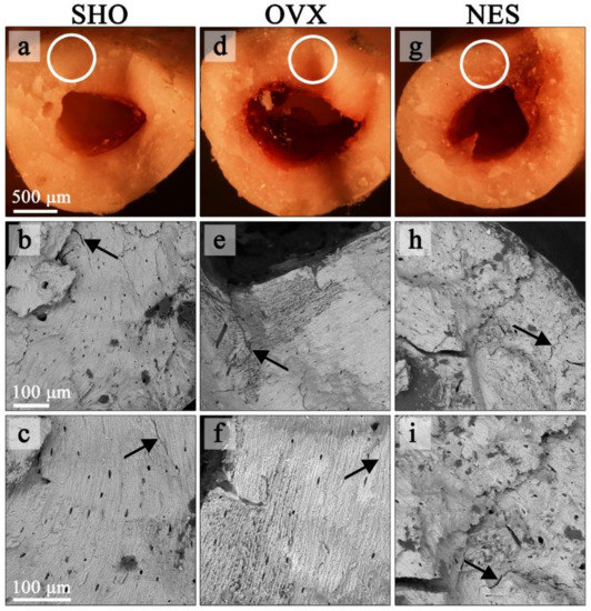 Stereoscopic (a,d,g) and SEM images (b,c,e,f,h,i) of bone fracture surfaces in the SHO, OVX, and NES groups. The SEM-imaged areas are marked with a circle on the stereoscopic photos. Arrows show bone tissue cracks.