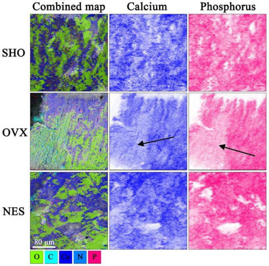 SEM–EDS elemental mapping. The black arrows show the areas with reduced calcium and phosphorus content in OVX humerus.