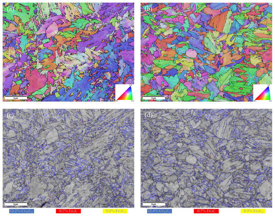 Figure 3c,d, the carbides were indexed based on the identification of their crystal structure. The two tempering regimes result in an almost similar fraction of carbides, which was estimated to be around 13%. However, it is assumed that such evaluation could be overestimated due to carbide size that is smaller than the EBSD pixel size (70 × 70 nm