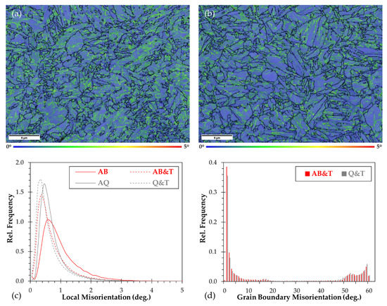 Figure 4d. The measurements demonstrate that both AB & T and conventionally treated Q & T microstructures are separated by high fraction of low angle grain boundaries (LAGBs < 15°) about 65.3% and 57.6%, respectively. A similar fraction of LAGBs (65%) was measured by Han et al. [