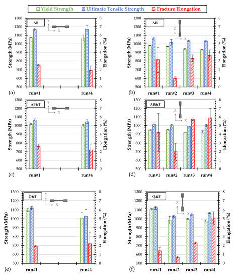 The average degree of anisotropy in both ultimate tensile strength and fracture elongation has been quantitatively evaluated by considering the ratio between horizontal and vertical properties. A low degree of anisotropy in tensile strength (around 1.12 ± 0.02) was measured for the as-built specimens, since the horizontal specimens always provided higher yield and ultimate tensile strength values, while better ductility (0.66 ± 0.18) was detected for the vertical loading direction. This anisotropy in strength could be reduced to 1.05 ± 0.01 after performing a direct tempering treatment at 550 °C, or even down to 0.98 ± 0.02 after applying the conventional Q & T treatment. However, the direct tempering resulted in an increased ductility anisotropy to reach a value of 0.50 ± 0.17.