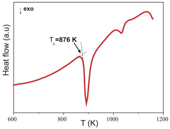 DSC curves for investigated Fe60Co12Gd4Mo3B21 alloys. Tx: the onset of the primary crystallization.