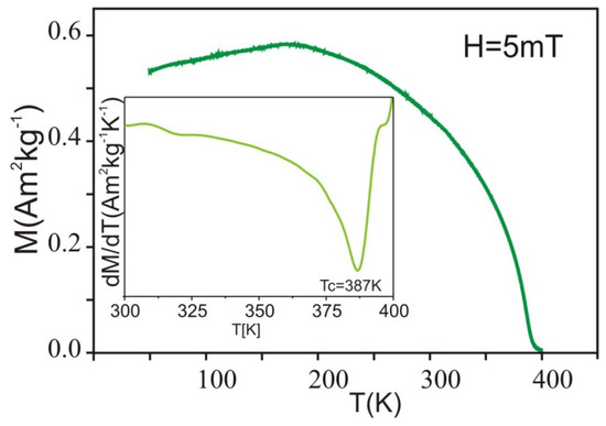 Figure 5 depicts temperature dependence of magnetic entropy change. Broad maximum is typical for amorphous materials. The maximum value of the ΔSM equaled 0.76 J (kg K)−1 under the change of external magnetic field Δ(μ0H) = 1 T. This values is higher or comparable than those presented in [9,13,14]