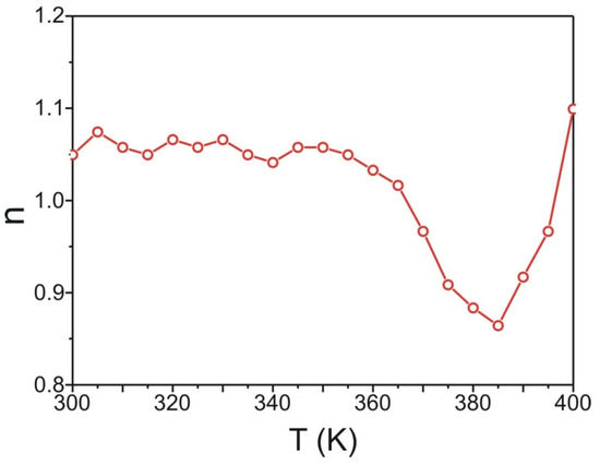 The amorphous alloys correspond well with the 3D Heisenberg theory and critical exponents given by this approach are β = 0.365, γ = 1.386 and δ = 4.797. Based on these values and Equation (6), the n exponent at the Curie point should be 0.88, as it is shown in [18]. The n vs. T curve constructed for studied samples are shown in Figure 7. The analysis of this curve revealed that the value of exponent n for the specimen in a ferromagnetic state (below TC) is a bit higher than 1, while in a paramagnetic state (above TC), the n does not reach 2. It could be related to the presence of some crystalline phase traces in the material.