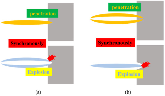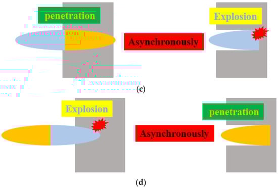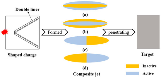 The composite jets generated from an inactive/active double-layer liner are impermeable and unspaced under extreme loading, are axisymmetric and rotational, and have a defined distribution once formed. Figure 1 shows the four basic distributions that can reflect the properties of the inactive/active composite jet, in which the yellow color represents the inactive part (Cu) and the silver-white color represents the active part (Al, obtained by cold spraying instead of the traditional machining to improve the activity). In the composite jet, Cu has much stronger penetration ability than Al, but Al causes much stronger aftereffects. The explosion-like reaction of Al also needs the high-speed impact that is necessary for activating RSMs [21].
