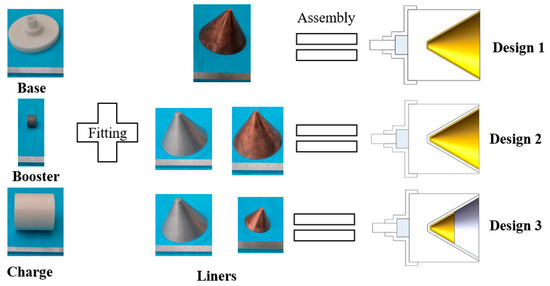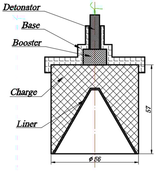 Three designs of shaped charge are prepared, all based on the structure of a 56 mm caliber shaped charge shown in Figure 3. The charge in Figure 3 is referred to as Design 1 and used as the control. The liner is 1 mm thick and made from copper. The liner has a cone shape with the top angle being 60° and the tip is truncated by machining. The main charge is RDX-based explosive JH-2 [27] (also known as 8701, ~1.71 g/cm3) pressed at room temperature. The booster is JH-14 (96.5% RDX, 3.5% fluorine rubber and colloidal graphite, ~1.70 g/cm3) pressed at room temperature. The base of the detonator is made from resin by 3D printing.
