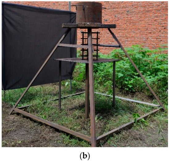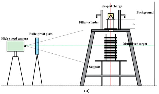 Figure 6 shows the schematic and the experimental setup of the jet penetration experiment. All specimens were placed in a protective steel cylinder with a uniform thickness of 30 mm to prevent lateral explosion. The first steel plate of the multilayer target tower was placed on the surface of a big support to filter the intense light leaking from the channel at the time of the explosion, and other plates were on the small support. The surface levels of the large and small supports were at 1350 mm and 780 mm high from the ground. A dark gray background was set behind the supports to improve the quality of the images. The blasting height was set to 200 mm by placing a PVC cylinder on the first steel plate. The FASTCAM high-speed photography device has a shooting frequency of 100,000 fps. A thick pane of bulletproof glass was placed in front of the camera to protect the equipment.