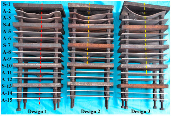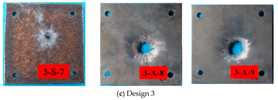 Impacted steel and aluminum plates in penetration experiments for design 1~3 (a–c): S for the steel plate and A for the aluminum plate.