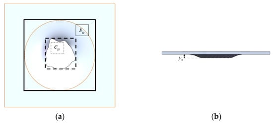 Evaluation of impact on plates: (a) top view; (b) side view: and for the perforation area, deformation area and deflection of plate n, respectively.