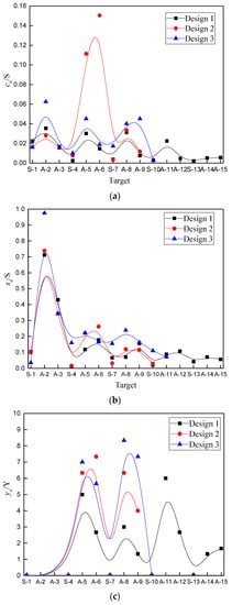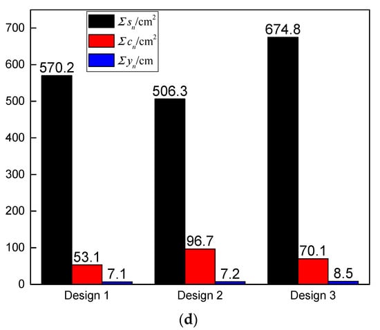 Figure 10d shows that the total deflection is almost the same for all three jets, and only design 3 has a slightly larger cumulative deflection. Note that deflection was not counted in Figure 10 for A-2 and A-3 because it would exceed the plate spacing (20 mm) if it was not blocked by S-4. However, the cumulative perforation and deformation vary significantly. Specifically, total perforation ranks in the order of design 2 > design 3 > design 1, and total deformation ranks in the order of design 3 > design 1 > design 2.