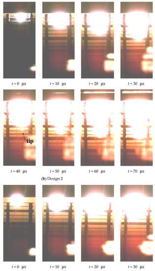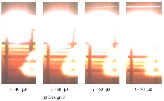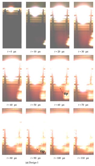 Figure 11 shows the jet, the target plates, and the flame from the explosion, and all bright light comes from high temperature or from the impact of high-speed jets on the plates. It is difficult to distinguish the contour of the jet on the image, and the lowest point of the bright color is the jet tip that travels the fastest. The velocity of the jet tip can be calculated by the penetration distance from 0 to 30 μs, including the gap and thickness of the target plates. The jet tip penetrates several more plates after going through the first Al plate, and the average velocity is 4133, 3867, 3467 m/s for design 1, 2, and 3, respectively.