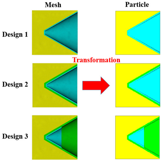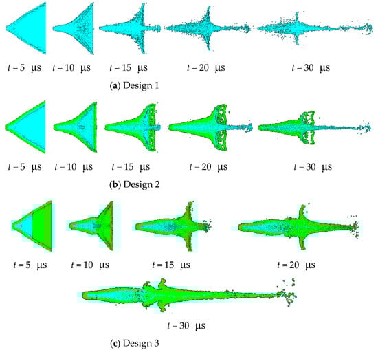 The smooth particle hydrodynamics (SPH) algorithm is employed to account for the collapse and severe deformation of the liners. Tetrahedral grids were established based on the simplified configurations of three designs and then transformed into a uniform SPH particle model, and there are no negative grids. A uniform mesh of 0.3 mm SPH grids is used globally in Autodyn-3D to ensure the calculation accuracy as well as the computational efficiency (Figure 12).
