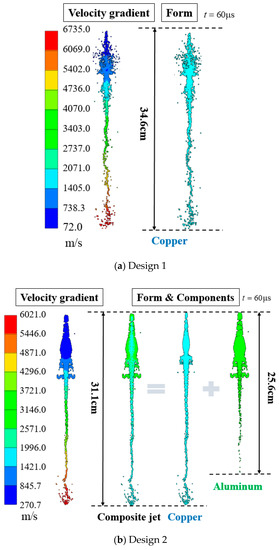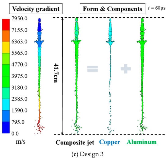Figure 14 shows the velocity gradient and the distributions of fully formed jets at t = 60 μs for the three designs. The difference between the simulated velocity and the experimentally measured velocity can be ascribed to the impact consumption. For design 1, the jet length is 34.6 cm at t = 60 μs, and the tip velocity of the Cu jet reaches 6735 m/s. For design 2, the tip of the composite jet is entirely made of Cu, and the Cu jet is coated with Al in the middle and at the tail. The Cu jet is 31.1 cm in length with a tip velocity of 6021 m/s, whereas the Al jet is only 25.6 cm long, thus demonstrating the substantial difference between the two velocity gradients. In contrast, for design 3, the 41.7 cm long Cu jet is entirely wrapped by Al from the tip to the tail. The velocity gradient is the same for both Cu and Al, with the tip reaching 7950 m/s.