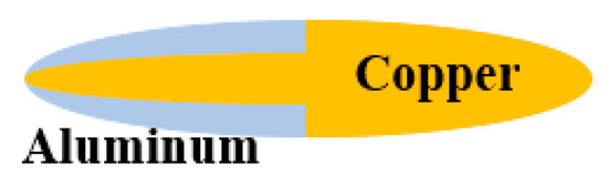 The different distribution of Cu and Al in the composite jets of design 2 and design 3 should account for the distinct PE effects observed in the experiments. The Cu/Al composite jet in design 3 corresponds to the basic distribution (a) in Section 2. The composite jet in design 2 is a combination of (a) and (c), which can be illustrated in a more straightforward way in Figure 15. Their different PE effects are well demonstrated by the penetration experiments, from the increasing amplitude of perforation and deformation as well as the profile and synchronization of firelight recorded by high-speed photography.